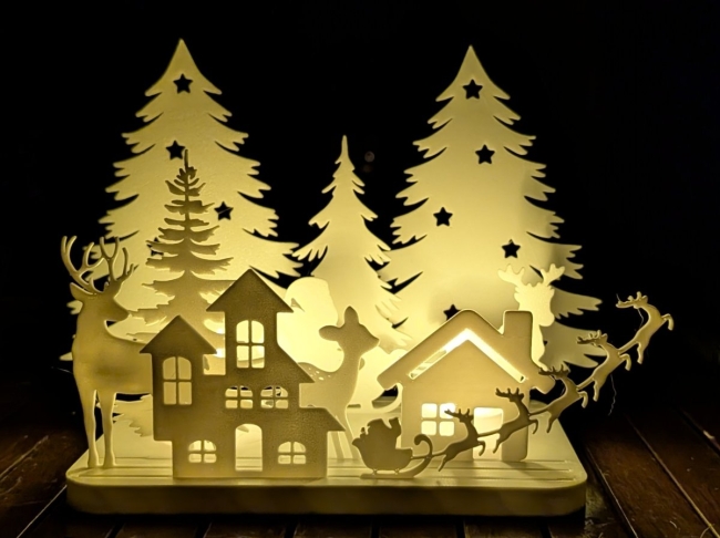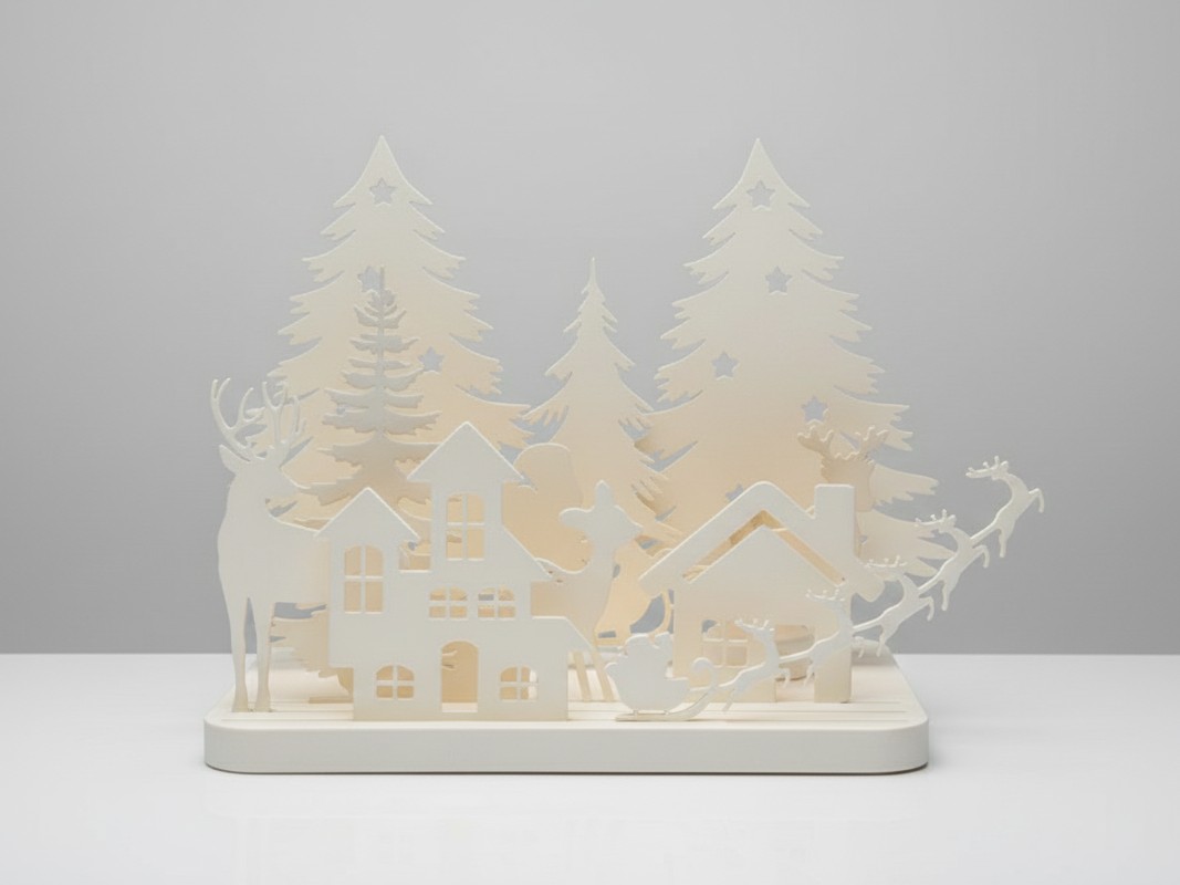 Crea l'atmosfera natalizia perfetta con un tocco moderno. Questo scenario multistrato crea un effetto di profondità incantevole. Le silhouette di abeti, case e renne si sovrappongono, e quando retroilluminate, proiettano ombre morbide che scaldano l'ambiente.